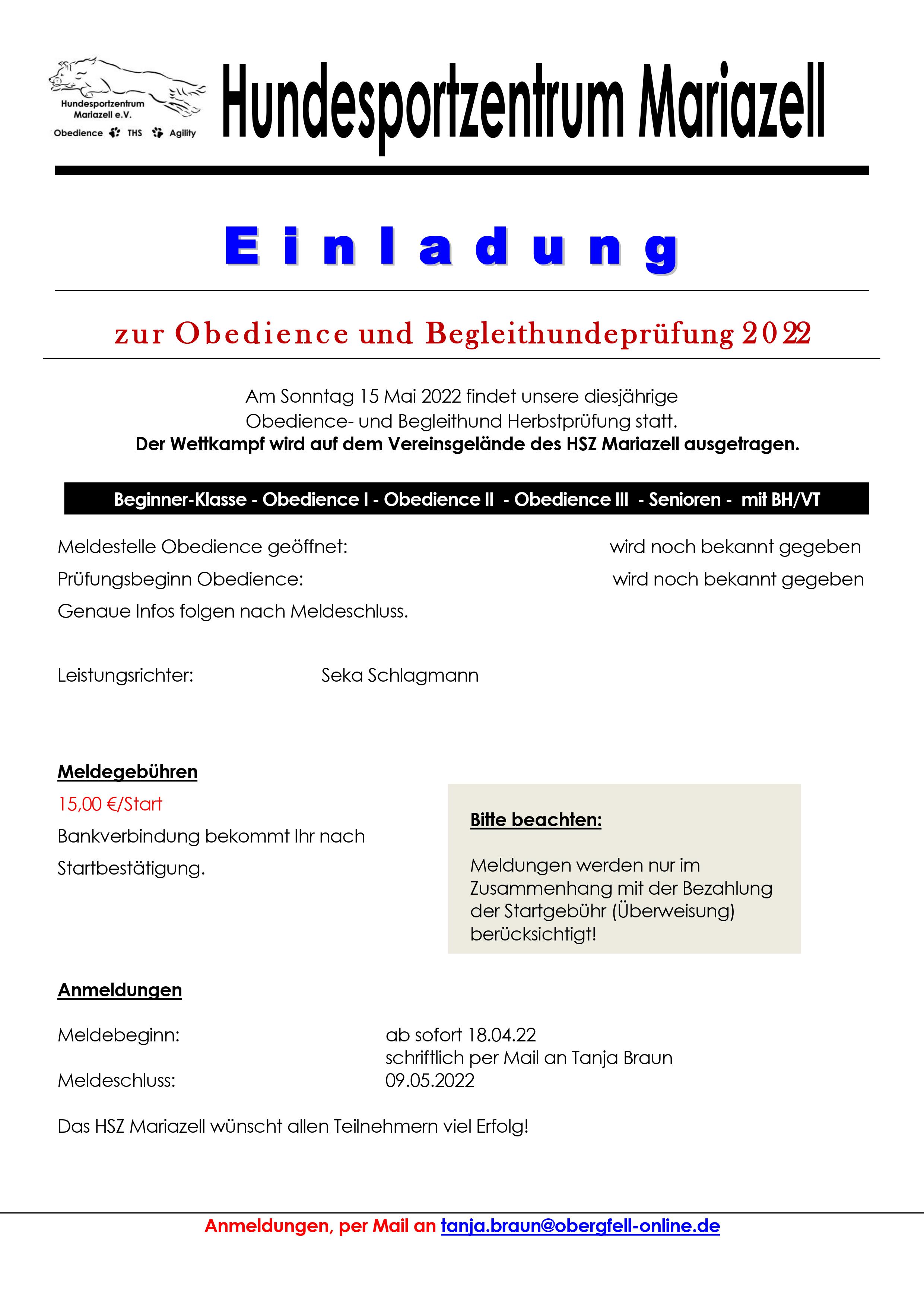 Einladung Obedience und Begleithundprüfung 15.Mai 2022