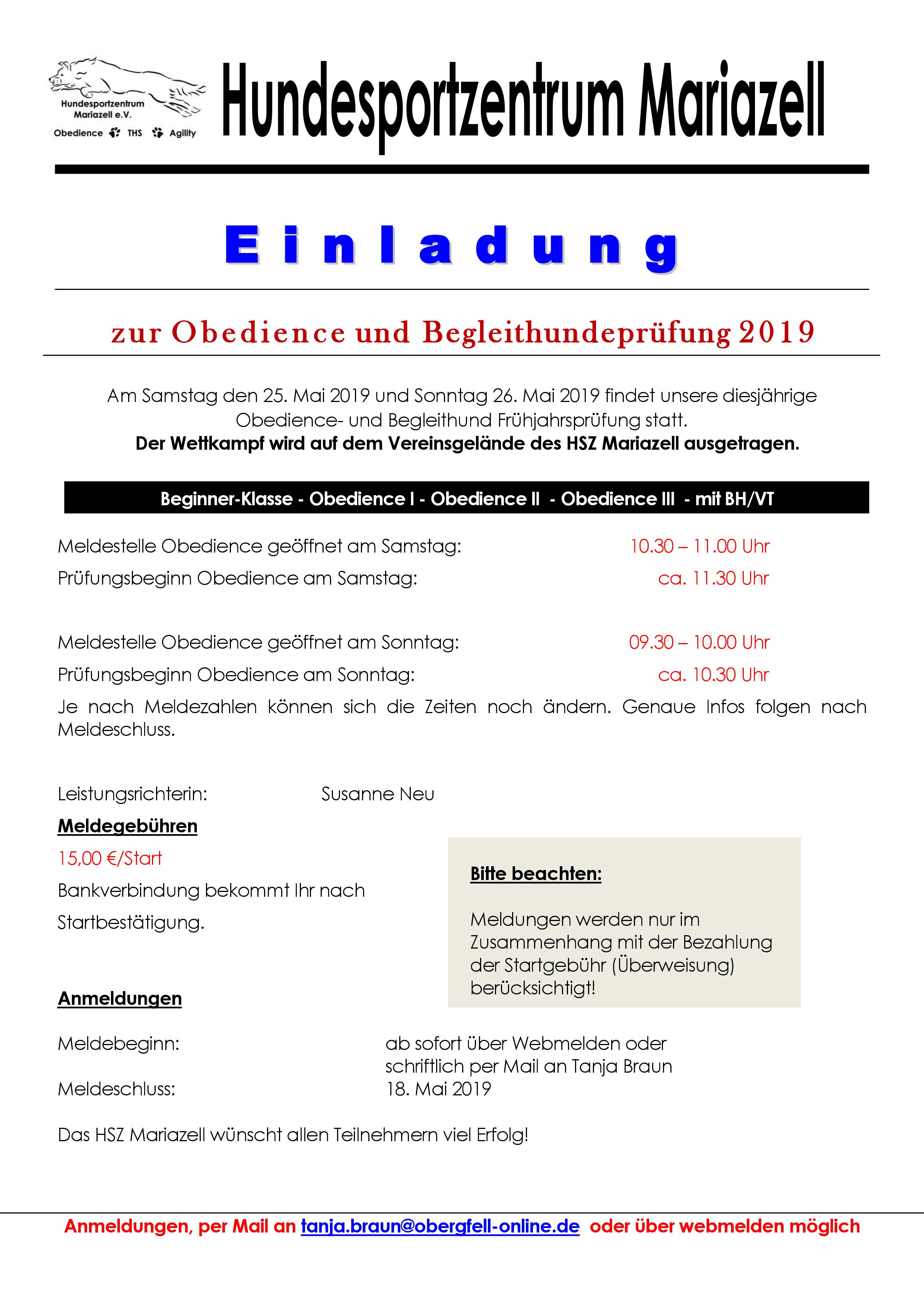 Wir laden euch recht Herzlich ein zu unserer Begleithund und Obedienceprüfung am 25. + 26. Mai 2019, als Richterin dürfen wir Susanne Neu aus dem Saarland begrüssen.